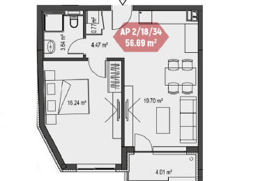 Апартаментът се състои от: антре, дневна с трапезария и кухненски бокс, спалня, санитарен възел и балкон. Западно изложение. Състоянието, в което се предава апартамента е на шпакловка и замазка с масивна входна врата от висок клас и дограма. Възможност за покупка на гараж.